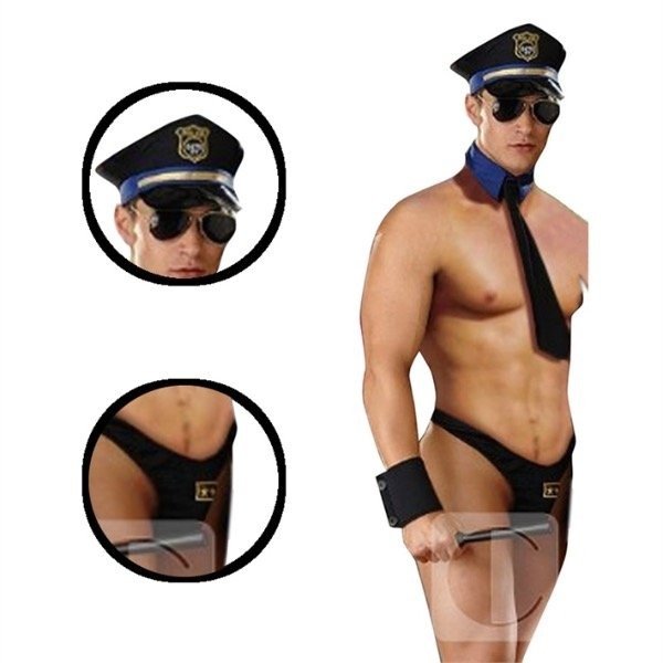 -Disfraz masculino de policía sexy, prenda sexy ideal para esos juegos de roles en pareja o para una fiesta temática. Hecho en materiales suaves contiene: 1 tanga, dos puños, corbata y gorro en talle único ajustable.